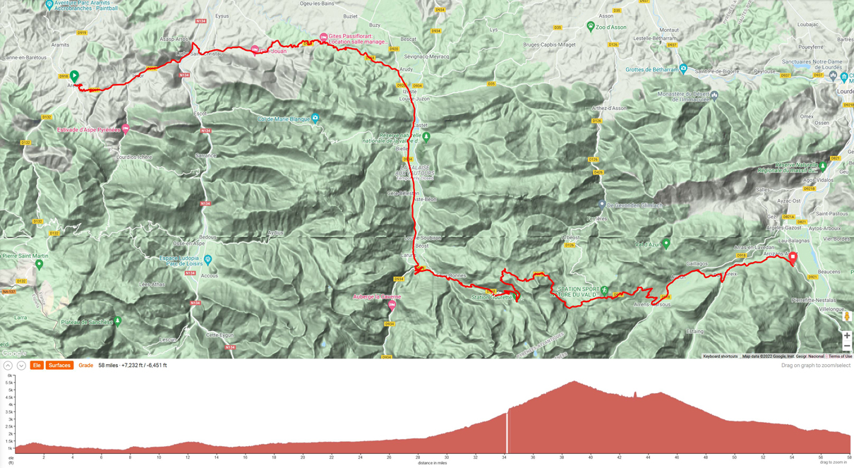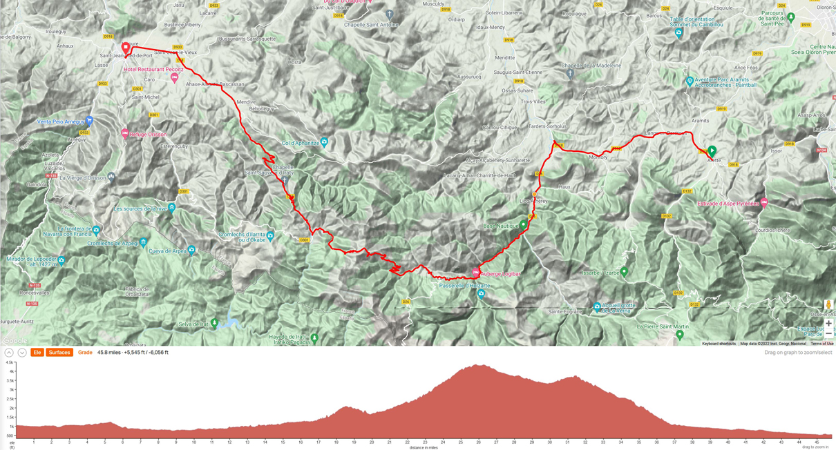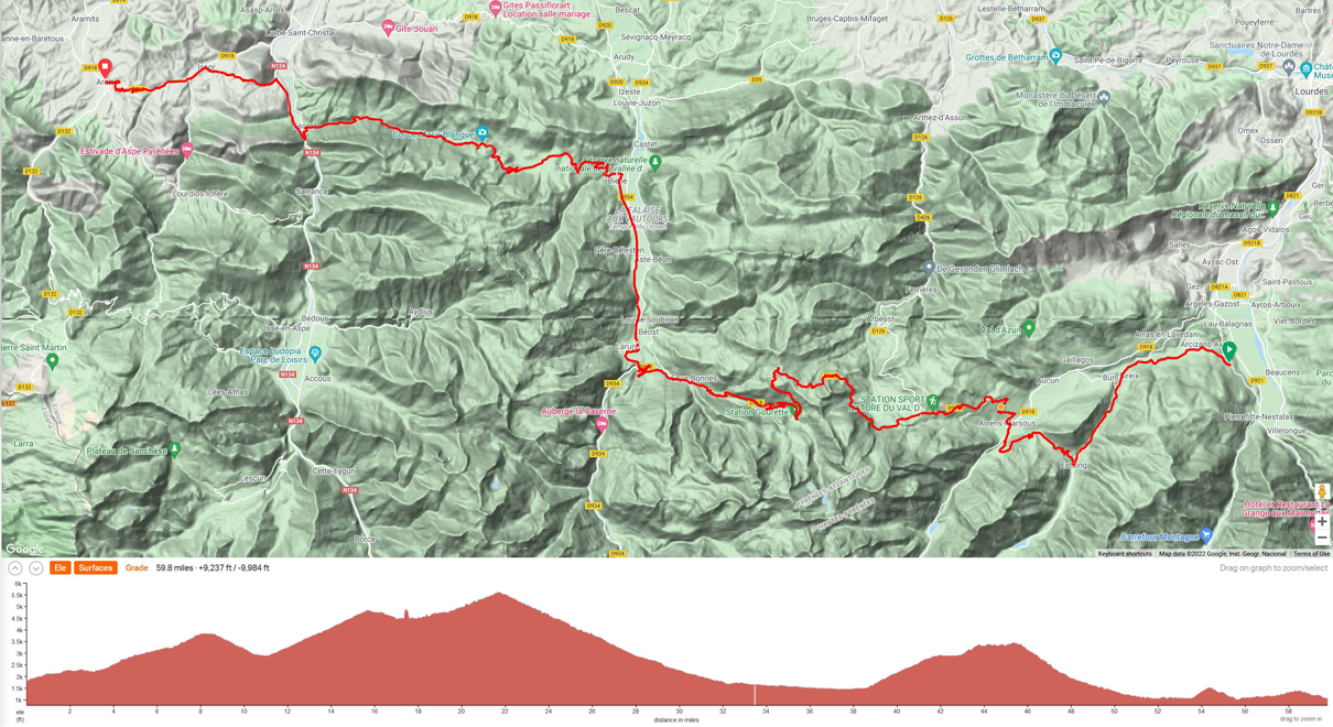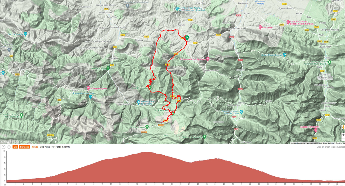 Ride 2 - Start town of Arette, Arette (French Basque region). This ride is a loop - out and back, as we stay 2 night in Arette. Distance approximately 40 miles, and 6000 ft climbing, the high mountain pass of the Col de la Pierre Saint Martin.