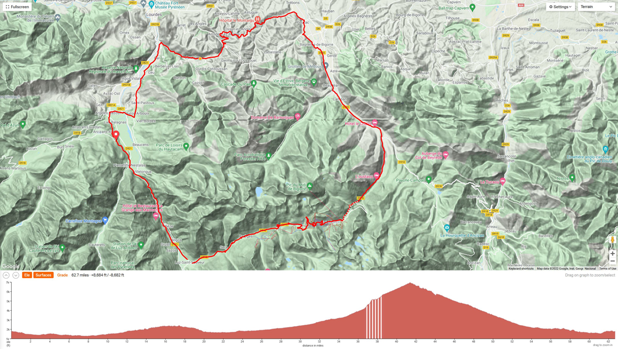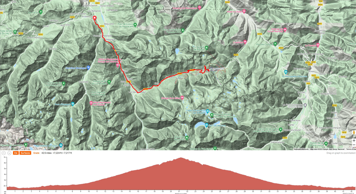 Ride 6 - Clockwise loop from the town of St. Sauvin. We will begin by traversing through the foothilss to then ride up the east side of the iconic Col du Tourmalet, and descend back down the west side. Distance 63 miles and 8600 ft climbing.