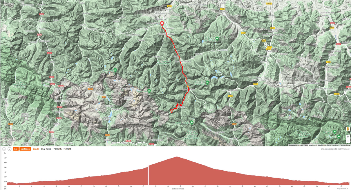 Ride 5 - Out and back ride from the town of St. Sauvin. We will ride up the canyon to the town of Gavarnie (World Heritage site for the Cirque du Gavarnie), and up the challenging climb of the Col de Tenton. Distance 55 miles and 7800 ft climbing.