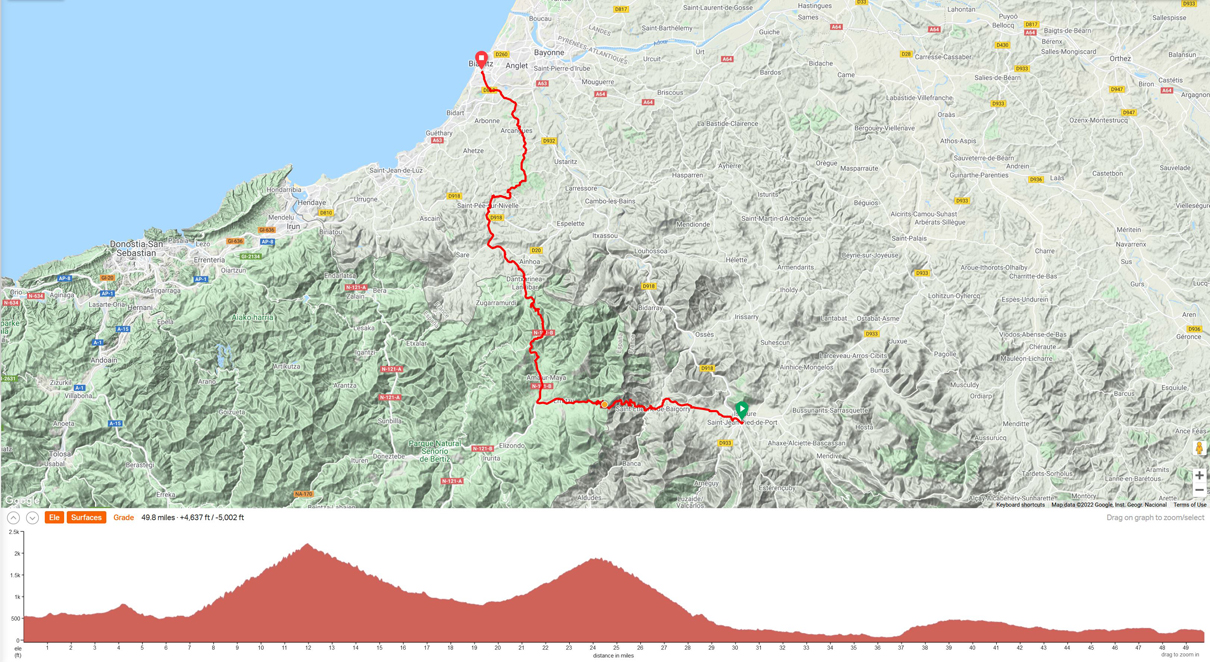 Ride 9 - The final day of riding. Starting from the town of Saint Jean Pied de Port and ending in Biarritz back on the Atlantic coast. Distance 50 miles and 4600 feet of climbing