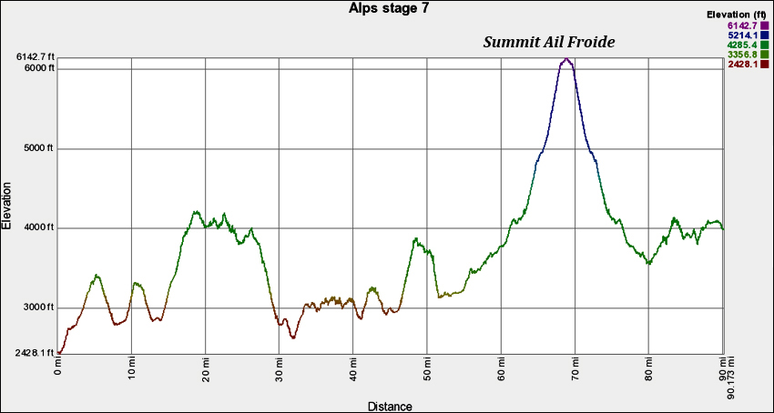 Another day away from the high passes, but nonetheless a big day of climbing as all the ups and downs add up to a little over 10,000 ft. We are still "in the Alps," that there is no doubt.