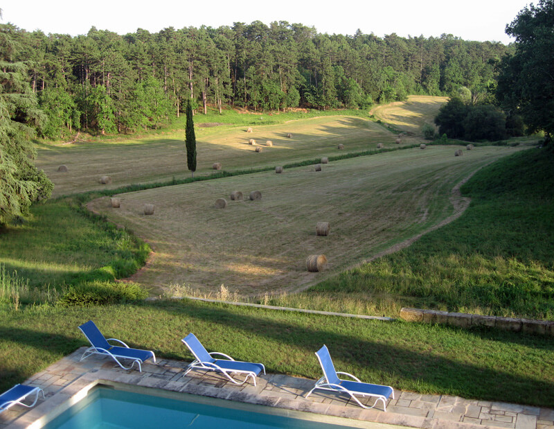 An aerial view of the chateau surrounded by the fields and forested areas of the porperty. Behind and to the side of the chateau are its vineyards.