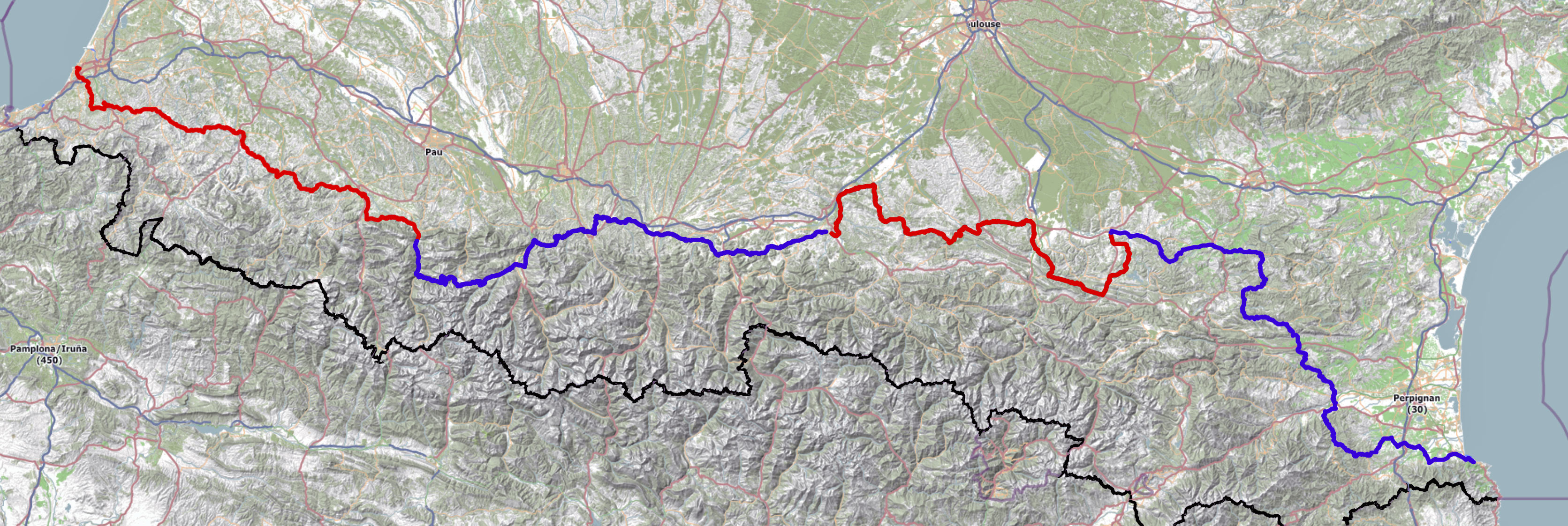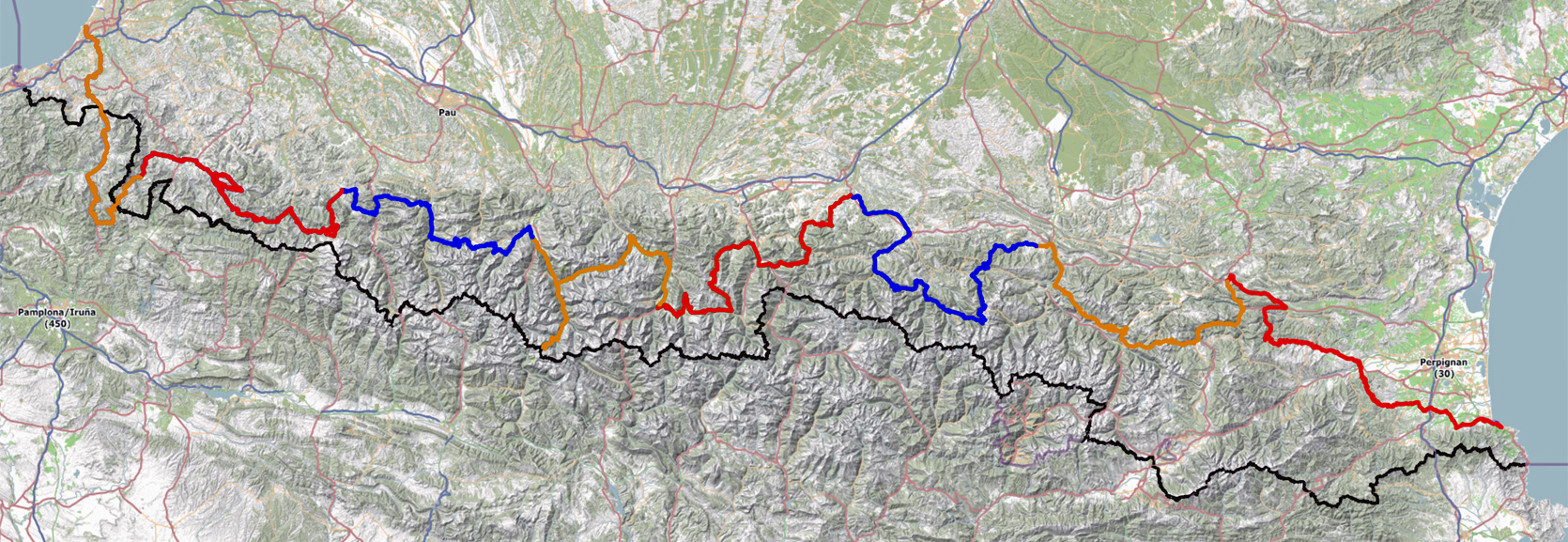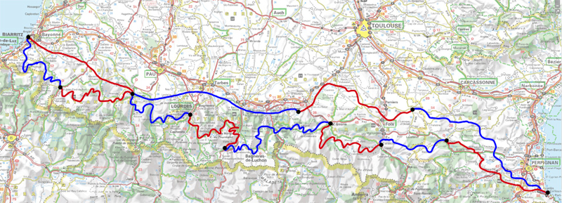 This (above) is the overview of the master route map for the trip. Below, farther down the page, are 2 more larger detailed layouts of the route map. The course is clockwise and starts on the Atlantic side of the Pyrenees (left side of the map-images). The first four stages stay in the foothills, and the returning 8 stages are in the high mountains.