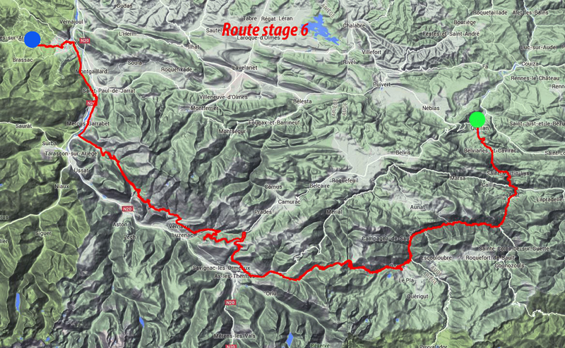 The beginning of Stage 6 from the town of Quillan takes us about 20 miles up the steep canyons to reach the foot of the Col du Porte de Pailheres.
