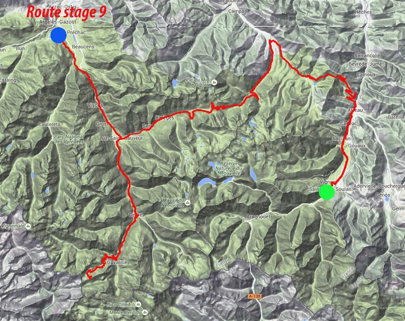 This stage has 3 historic and renowned climbs, each distinctly diffent. We will reach the highest elevation of the tour at 7243 feet. We start with the Col d'Aspin and a view that is argueably the most fantastic of the trip, though I hestitate to say so since all the views are spectacular. The second climb is the Tourmalet, which in all likelyhood everyone has been thinking about since the beginning of the tour. It will not disappoint! And the third climb you've probably never heard about, but get ready to be thrashed. It is actually slightly higher (7243 ft) than the Tourmalet (6939 ft). Today is all up or down, there is literally nothing flat. The descents are second to none. It is another huge day.