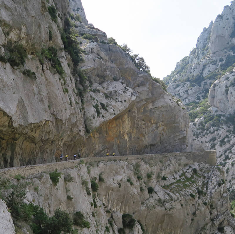 The passage du Gallimus, a short 1 mile carving through the rock, about 50 miles inland from the Mediterranean. The road is narrow and car traffic is controlled and alternating by a stop light.