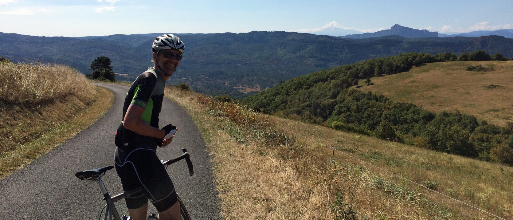 Chris D. riding through the Pyrenees foothills on the way to the Mediterranean coast.